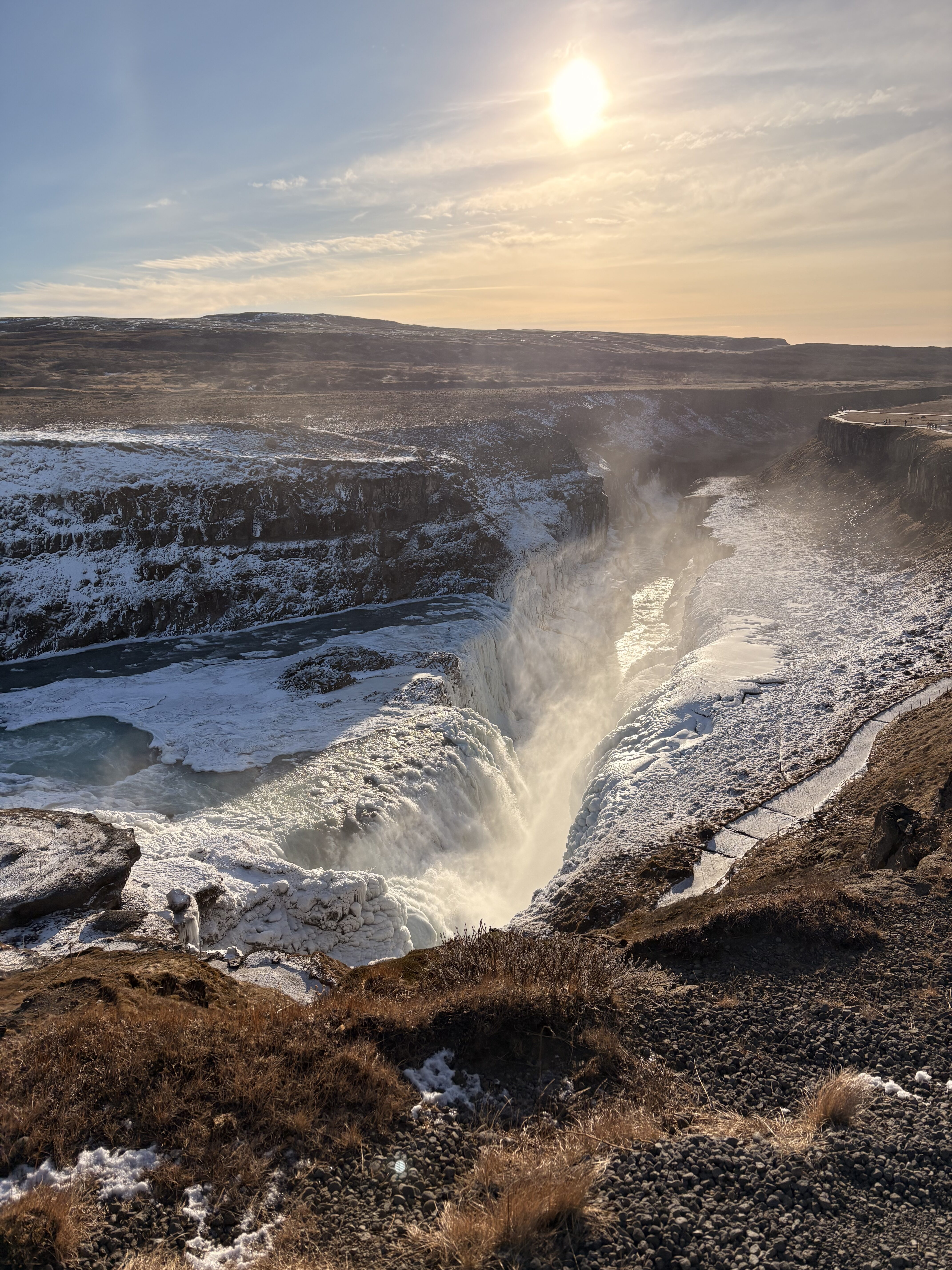 After this we got the opportunity to go into one of Iceland’s many lagoons, the secret lagoon, which is a geothermal hot spring creating a natural pool. Here lots of us ventured into the cold plunge seeing who could last the longest, and then relaxing in the hot tubs powered by natural geothermal activity. After a while in the lagoon, we were back onto the coach on our way to Gullfoss falls which is an amazing two storey waterfall mostly frozen over where we made sure to take lots of photos. There were streams of water carrying icebergs downstream eroding the deep valley where it resides.