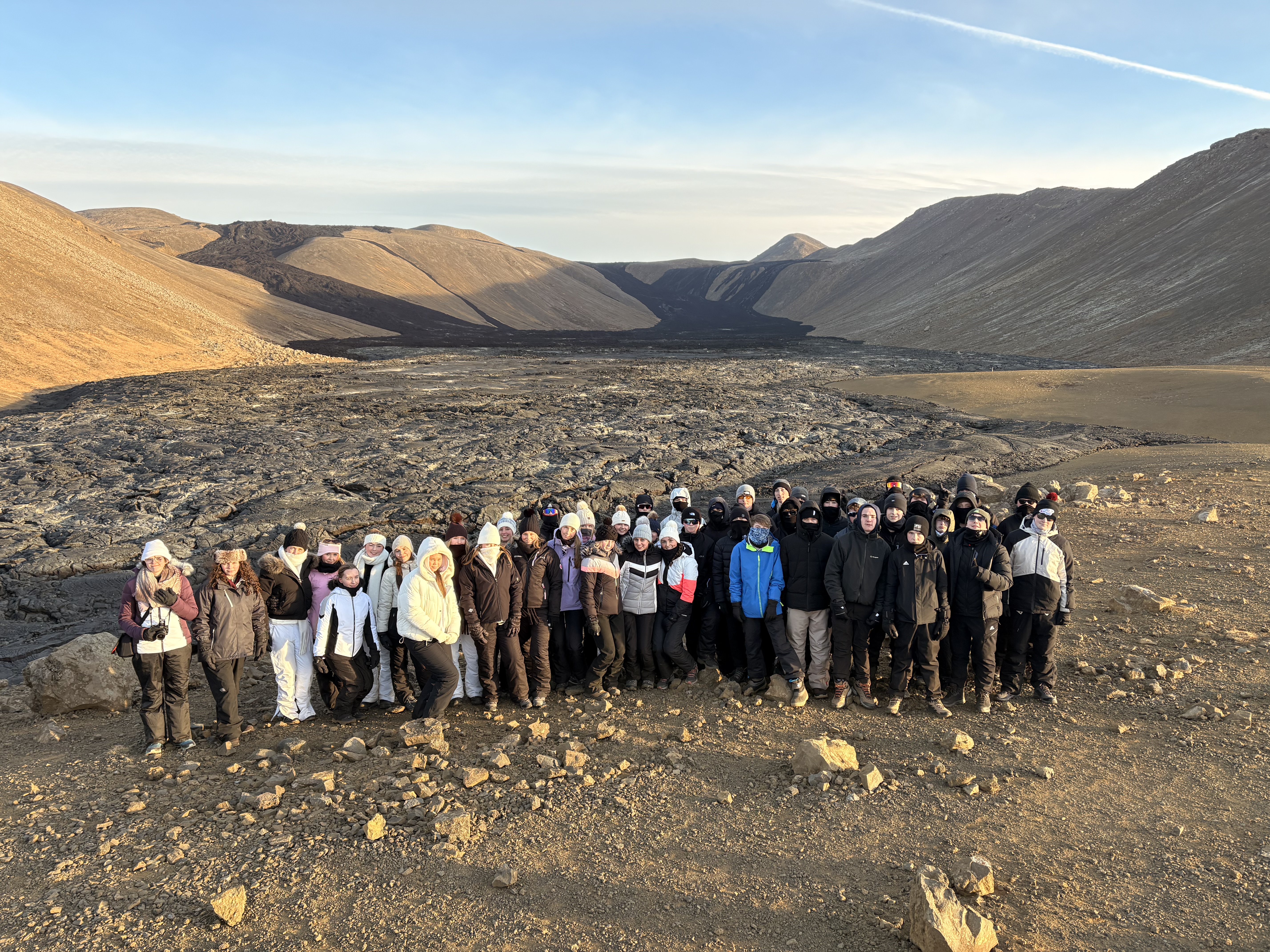 The first full day started with an early breakfast and the first stop at an extremely large lake called Kleifarvatn, frozen over with the sun rising leaving a beautiful scene across the solid ice. This stop made us all aware of how cold and windy it really was and we realised for the next stop the warm layers were really needed. We then got back onto the coach to make our way to our next stop. After a short walk we arrived at a lava lake where you could still see magma steaming from the eruption from 2021 which carried on erupting up until 2023.